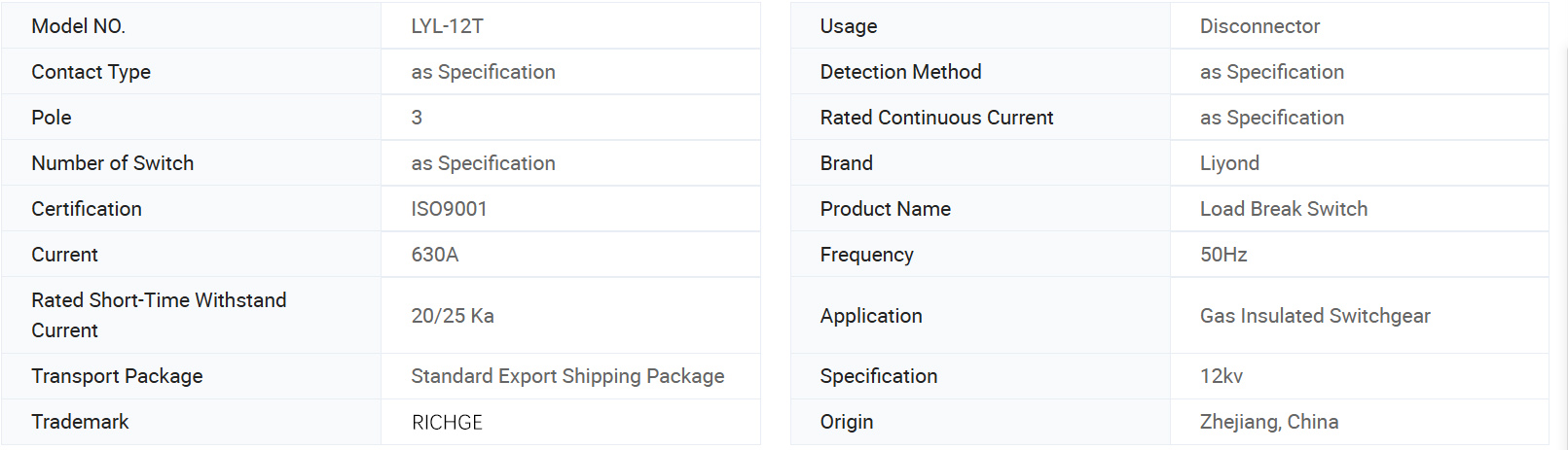 LYL-12T yük anahtarı, GB3804-2004 "3.6kV~40.5kV yüksek gerilim AC yük anahtarı" ve GB16926-1997 "AC yüksek gerilim yük anahtarı-sigorta kombinasyon cihazı"nın ilgili gerekliliklerine uygundur. Ana devre: 630A-20kA (4s), 25kA (3s); Mekanik ömür: 5000 kez; Topraklama devresi: 20kA (2s); Mekanik ömür: 2000 kez.