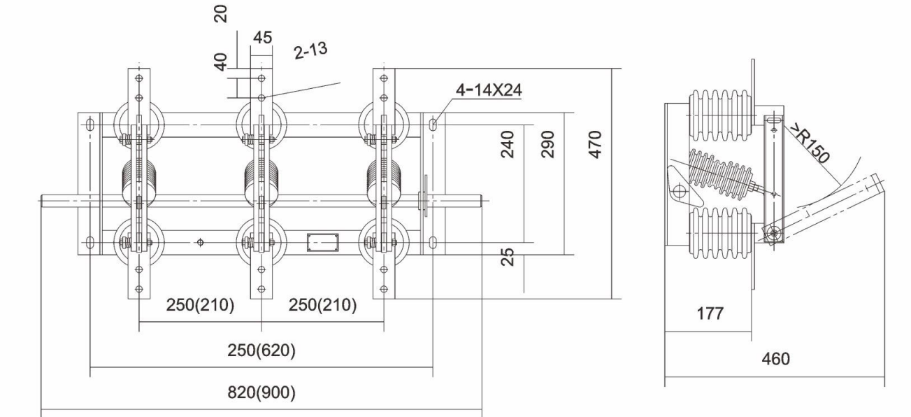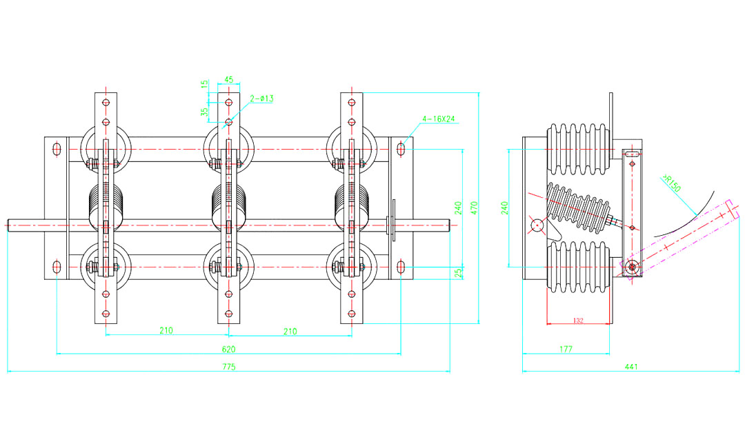 GN19-12/400, 630, 1000, 1250 tip bağlantısı anahtarının iletken kısmı, her faz için iki sütun izolatörü ile tabana sabitlenir. (GN19-12C/400, 630, 1000, 1250 tipi bir sütun izolatörü ve bir porselen muhafaza izolatörü vardır.) Üç faz paralel olarak kurulur ve iletken kısım temas bıçaklarının ve temas sahiplerinin (veya iletken çubuklar) statik kontaklarından oluşur. Kontak bıçağının her aşaması, kravat izolatörünün ortasına bağlanır, kravat izolatörüne bağlanır ve iş mili bağlı tabanına monte edilir. İş mili, bağlanma çubuğuna (kullanıcı tarafından sağlanan) ve CS6-1 tipi hareketli mekanizma tutamağına bağlanır. Bağlantı kontak bıçağı, sadece alt sıcaklığı düşürmek için temas bıçağının ısı yayılma alanını arttırmakla kalmaz, aynı zamanda temas bıçağının mekanik mukavemetini de iyileştirir, böylece anahtarın dinamik stabilitesi iyileştirilir. Kontak bıçağının bir ucu temas bloğuna (veya iletken çubuğa) bir cıvata (Shaw arabası) ile monte edilir. GN19-12/1000, 1250 manyetik kilitleme plakasının montajı ile temas halinde, ayrıca manyetik kilitleme plakasının amacı, büyük bir kısa devre akımının | cazibe. GN19-12/400, 630 Bağlantı Kesme Anahtarları akım boyunca küçük bir sınır vardır, bu nedenle manyetik bir kilitleme plakası eklemeye gerek yoktur.