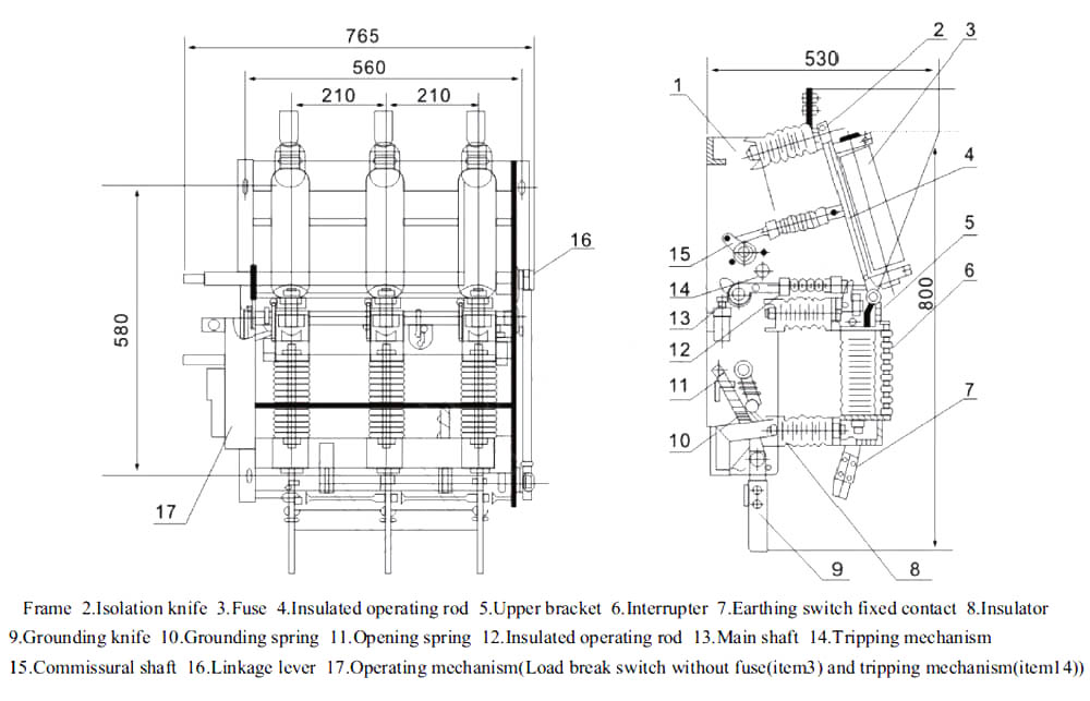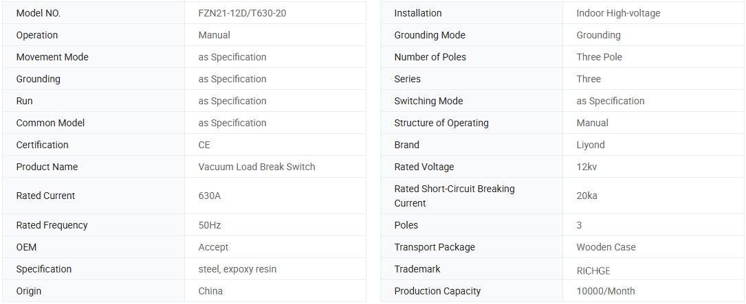 FZN21-12 Serisi Yüksek voltajlı vakum yük anahtarı esas olarak çerçeveden oluşur, bağlantıyı kesme anahtarı (birleştiricinin akım sınırlayıcı sigortası, bağlantıyı kesme anahtarındadır), vakum anahtarlama tüpü, topraklama anahtarı, yay çalışma mekanizması vb. Bu ürün kompakt yapı, küçük hacim, uzun ömür, güçlü kapanış ve kırılma kapasitesi ve kolay çalışma ve bakım vardır. Vakum anahtarı, bir elektrik motoru (başka bir manuel) yay enerjisi depolama alanını benimseyen ve iki tür kapanış yöntemi vardır: elektromanyet kapanma ve manuel bölme ve kapanma. Yanlış ameliyatı önlemek için bağlantıyı kesme anahtarı, vakum anahtarı ve topraklama anahtarı birbirleriyle (mekanik birbirine taşıma) kilitlenir.