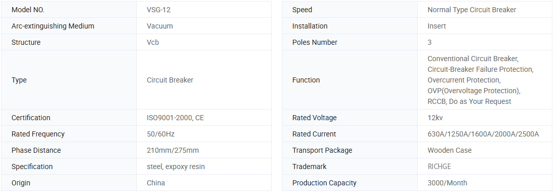 VSG-12 Tip İç Mekan Yüksek Voltajlı Vakum Devre Kesici Depolama Enerjisi için Yay Kullanıldı. Çalışma mekanizması, manuel ve elektromotif çalışma ile iki yönlü çalıştırılabilir, özellikler GB1984-2003 yüksek voltajlı AC devre kesici, JB3855-1996 3.6-4.5kv yüksek voltajlı AC devre kesici ve IEC Standardı 622271-100: 20012271-100: 2001 Yüksek voltom Kesme