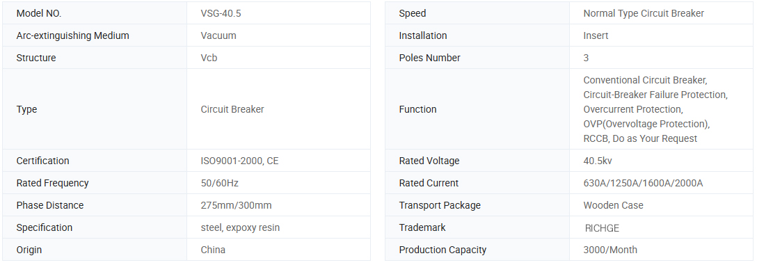 VSG-40.5C Tip Yan Kurulum İç mekan yüksek voltajlı vakum devre kesici, depolama enerjisine yay kullanıldı. Çalışma mekanizması, manuel ve elektromotif çalışma ile iki yönlü çalıştırılabilir, özellikler GB1984-2003 yüksek voltajlı AC devre kesici, JB3855-1996 3.6-4.5kv yüksek voltajlı AC devre kesici ve IEC Standardı 622271-100: 20012271-100: 2001 Yüksek voltom Kesme